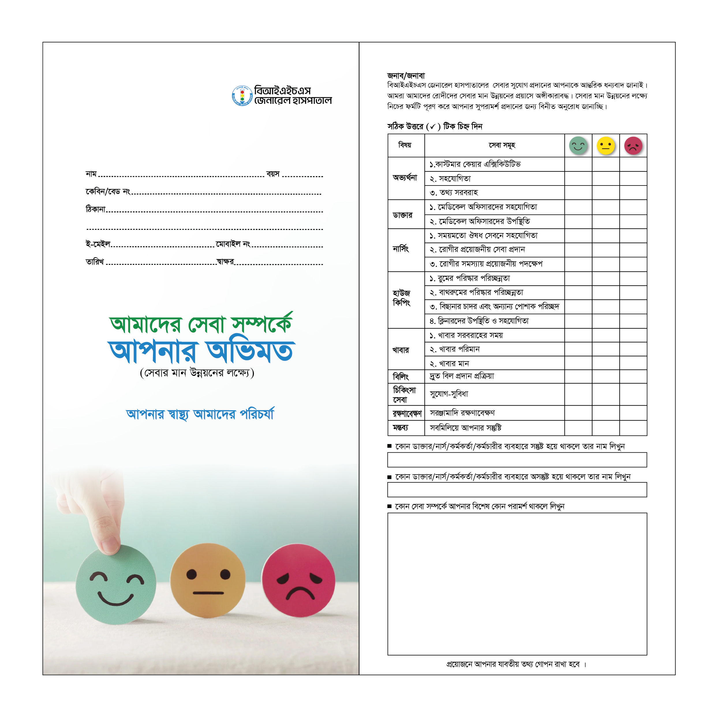 At BIHS General Hospital, we value the voices of our patients. We have established a comprehensive Patient Feedback System that operates during the discharge process to ensure we continuously improve the quality of our care and services. Every patient’s opinion is important to us — we carefully review and respect the feedback provided to enhance patient satisfaction, safety, and overall hospital experience. Your insights help us grow and serve you better every day.